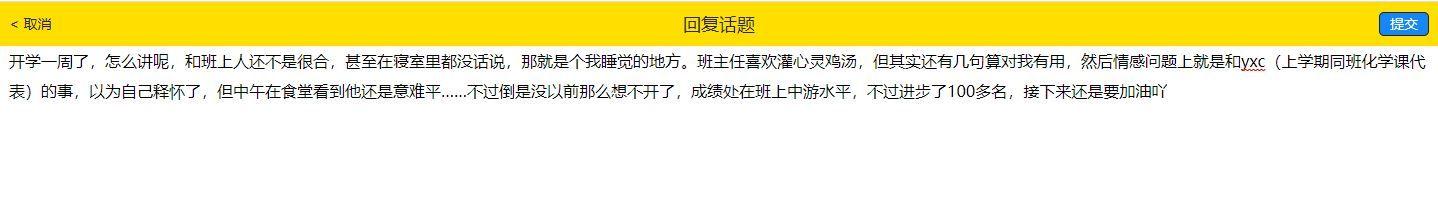 聊下最近的近况,和qmz(上学期一个关系比较好的男生)发生了一些有趣的事,他说我是个很好的女孩子(开心),第二次单独一起吃饭啦,开导了我很多,和yxc也和好啦,因为qmz的班在我楼下,他们班还有几个我认识的,所以最近没事就跑楼下去嗑捞。班上已经有小团体了,追星的,寝室也还是融不来,无所谓啦认识这么多人干嘛一个人不挺好,不过这两天换座位后同桌有点粘我…成绩再仔细看了下,还是有很大进步的,最近得学习状态也找到了当初初一拿年一的感觉,继续加油吧,一切都在朝好的一面发展