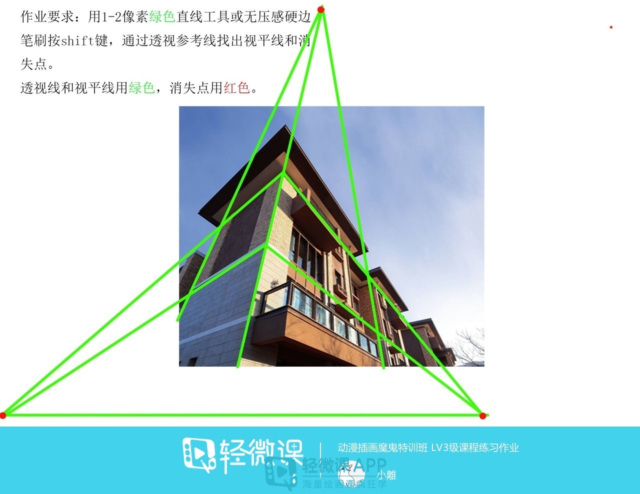 三点透视根据站点的高低,高度线或消失于天空中的天点,或消失于地面中的地点,另外两组深度线延长与视平线形成两个消失点,消失在地平线上,另一个消失点消失在天空或地面。三点透视是三个消失点,一般会用在对高层建筑的描绘。